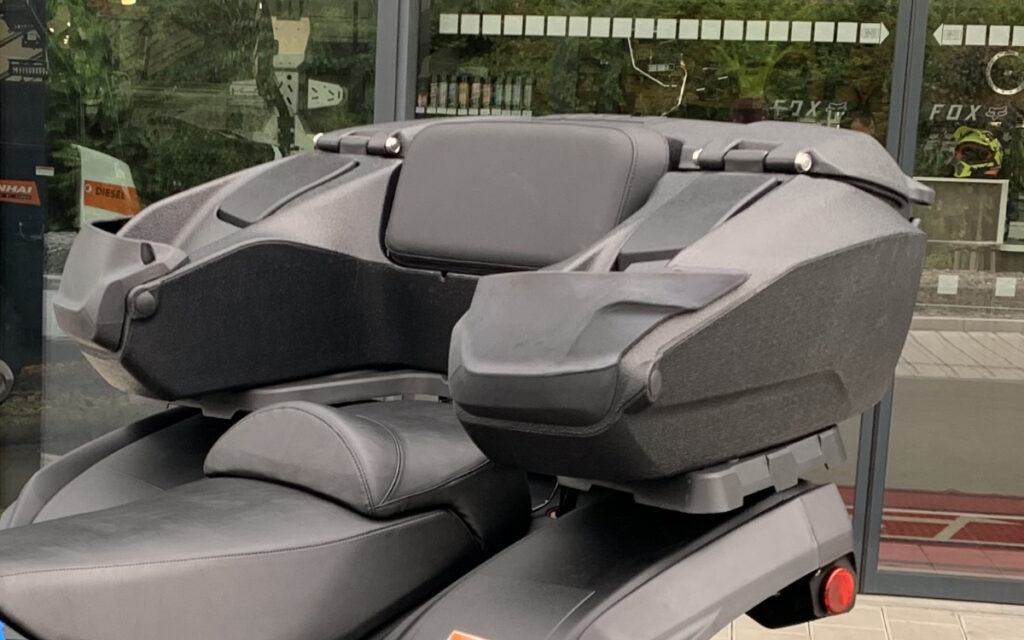 Velký uzamykatelný vodotěsný zadní plastový box s opěrkou zad pro prodloužené čtyřkolky, velmi tuhá stabilní dvouplášťová konstrukce, velký vnitřní prostor až pro tři integrální helmy, zadní osvětlení z LED diod, kvalitní těsnění proti vodě, opěrka zad, kryty madel spolujezdce