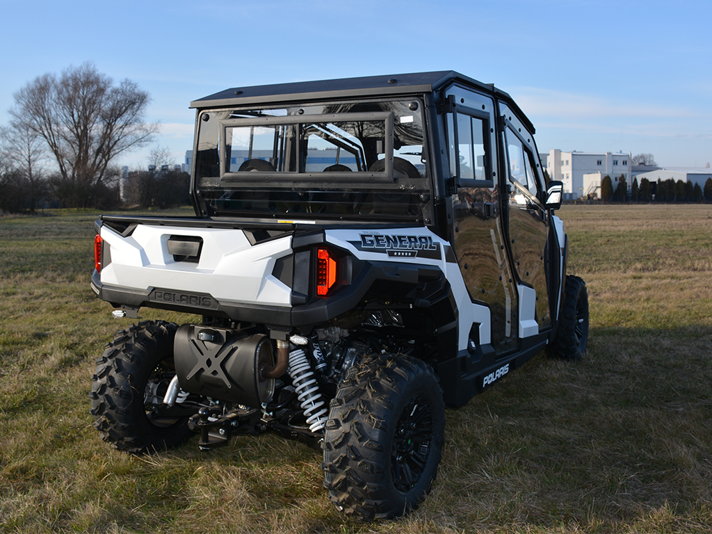 Vyhřívaná kabina pro POLARIS General 4 1000, čiré polykarbonátové dveře, uzamykatelné, o 180° otevíratelné, s posuvnými okny, přední okno z bezpečnostního skla se stěračem a ostřikovačem, zadní čelo z čirého tvrzeného UV-odolného polykarbonátu, teplovodní topení