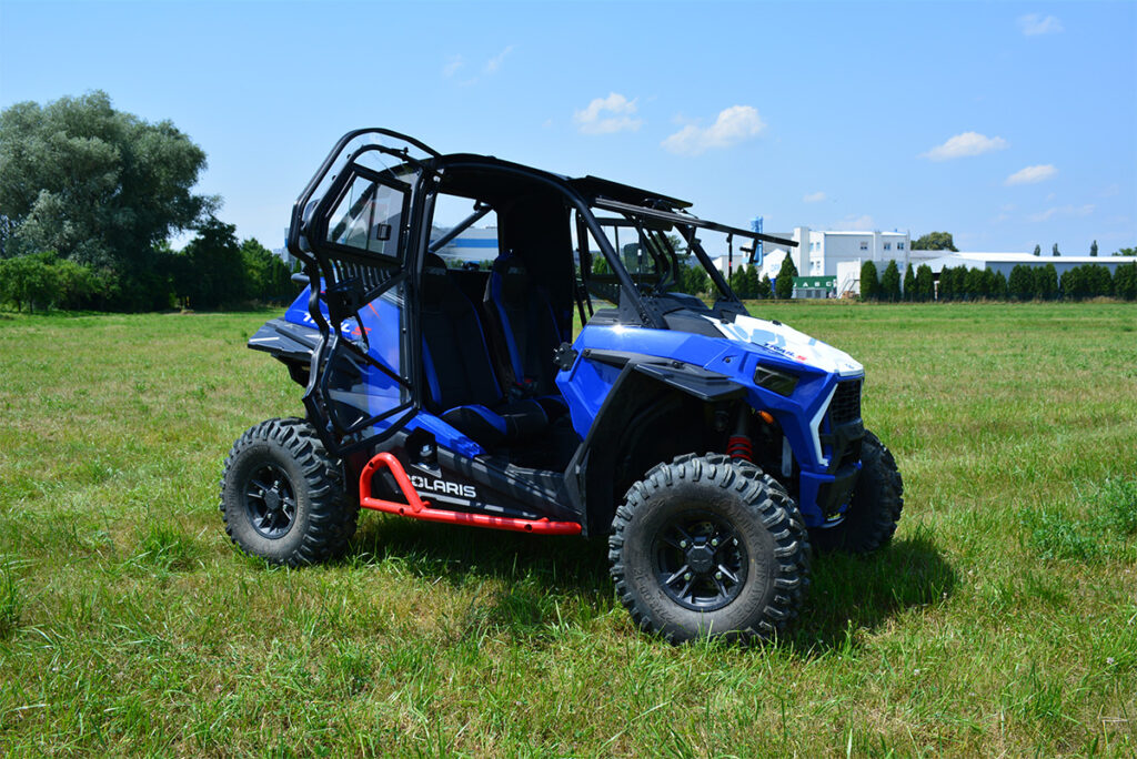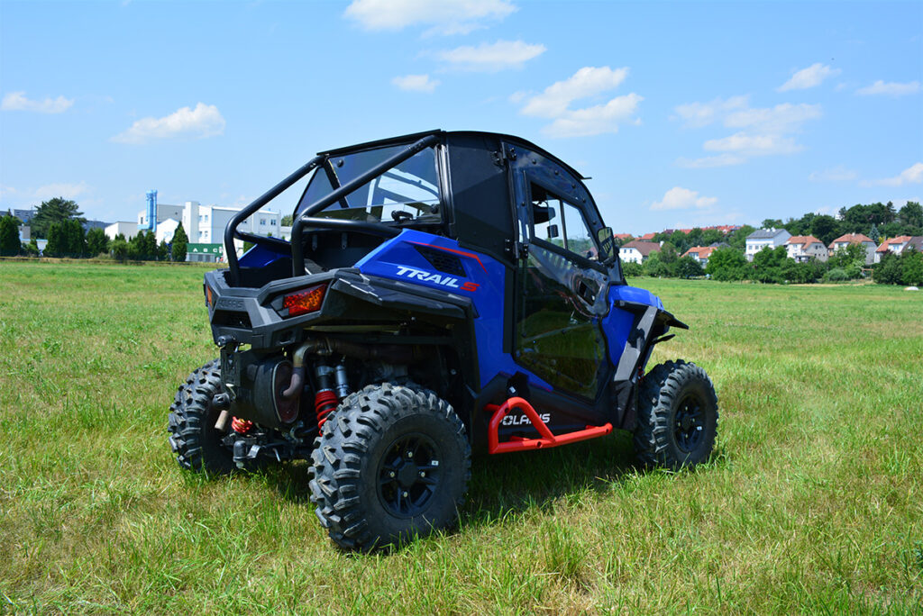 Vyhřívaná kabina pro Polaris RZR TRAIL S, čiré polykarbonátové dveře, uzamykatelné, o 180° otevíratelné, s posuvnými okny, přední okno z bezpečnostního skla se stěračem a ostřikovačem, zadní čelo z čirého tvrzeného UV-odolného polykarbonátu, teplovodní topení