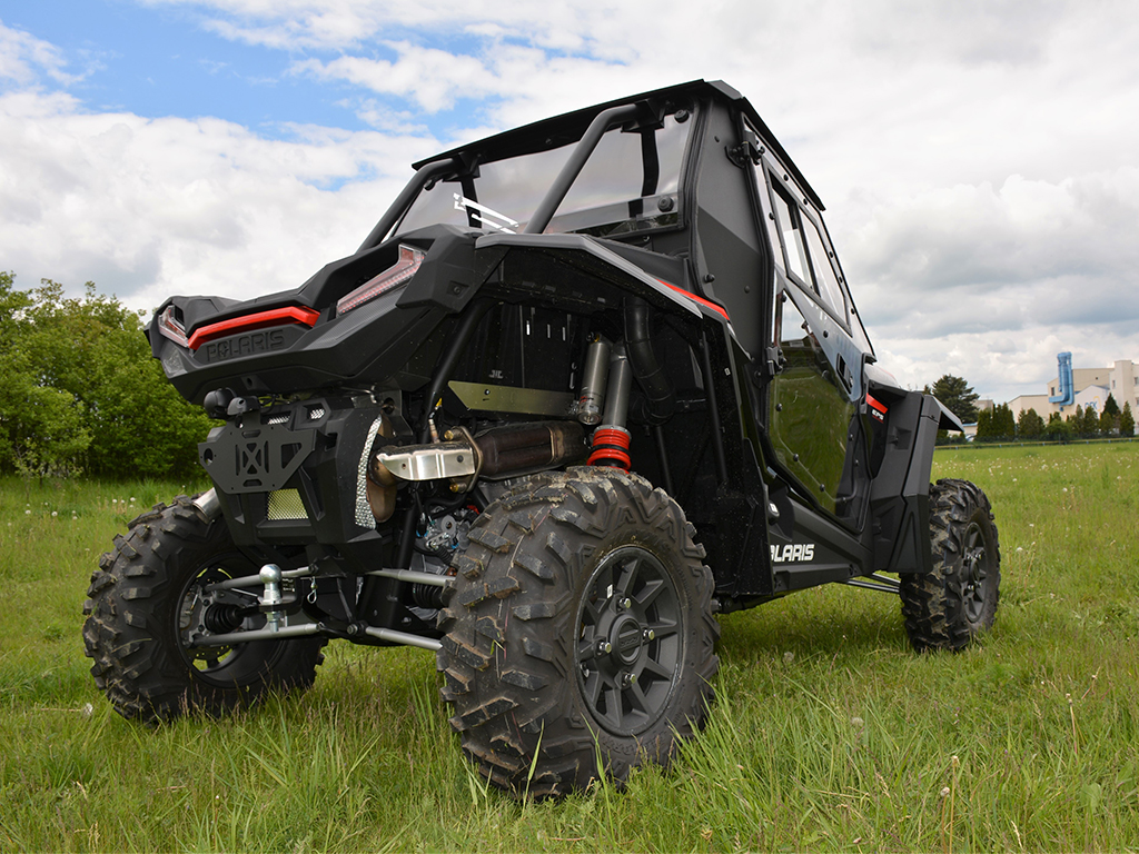 Vyhřívaná kabina pro Polaris RZR XP 1000 (2019), čiré polykarbonátové dveře, uzamykatelné, o 180° otevíratelné, s posuvnými okny, přední okno z bezpečnostního skla se stěračem a ostřikovačem, zadní čelo z čirého tvrzeného UV-odolného polykarbonátu, teplovodní topení