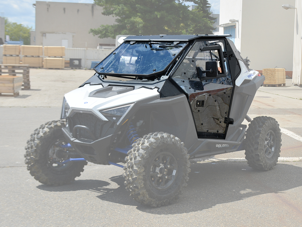 Vyhřívaná kabina pro Polaris RZR XP PRO, čiré polykarbonátové dveře, uzamykatelné, o 180° otevíratelné, s posuvnými okny, přední okno z bezpečnostního skla se stěračem a ostřikovačem, zadní čelo z čirého tvrzeného UV-odolného polykarbonátu, teplovodní topení