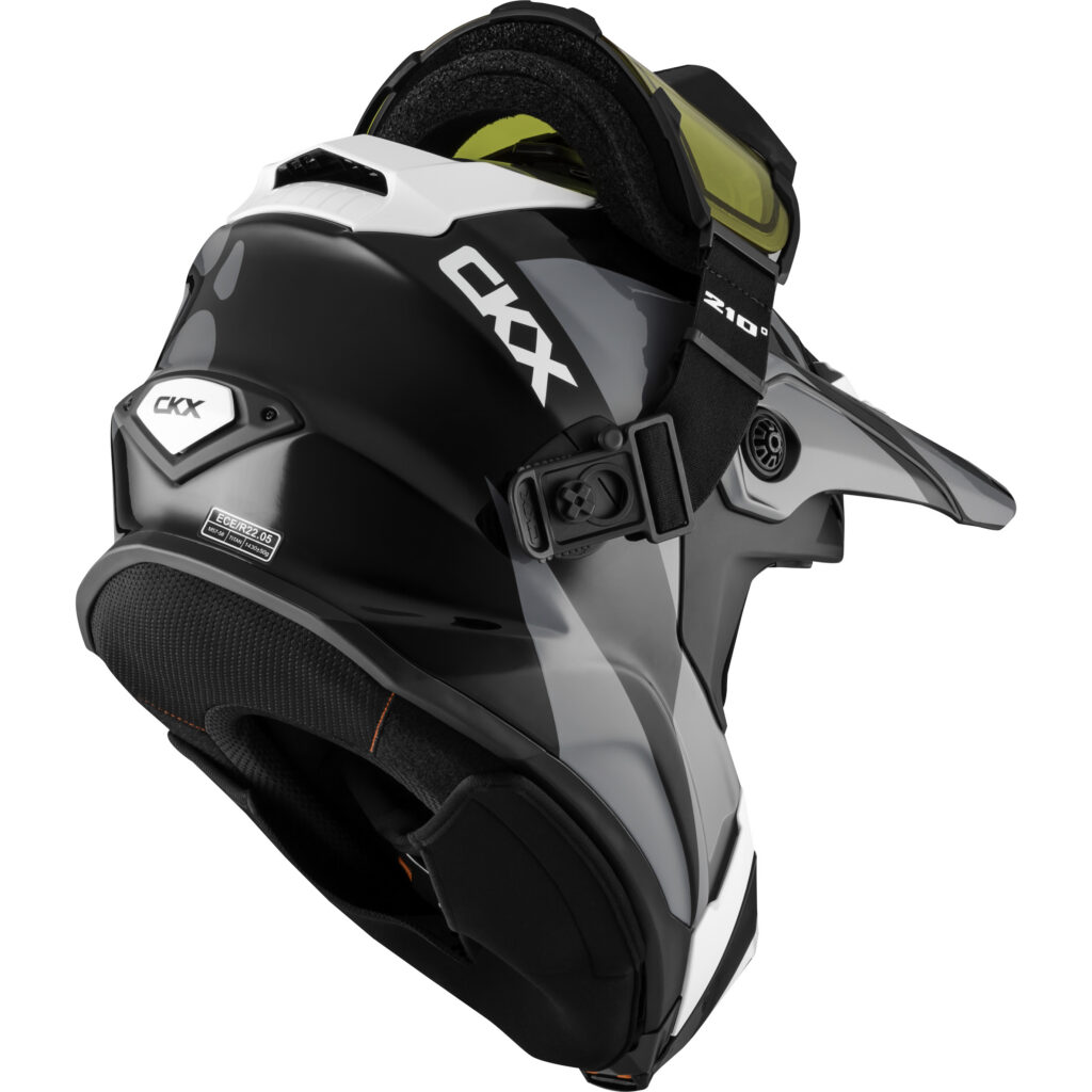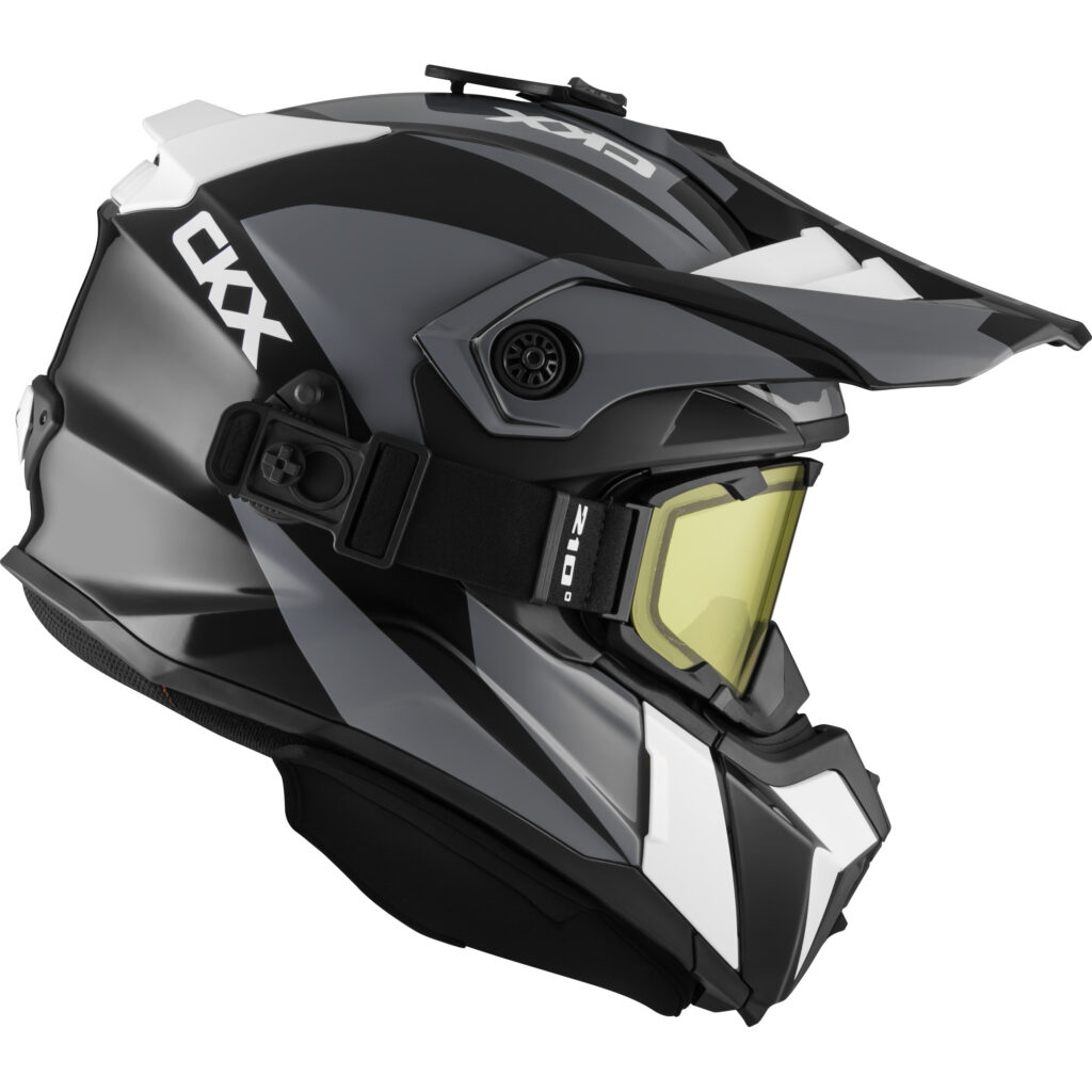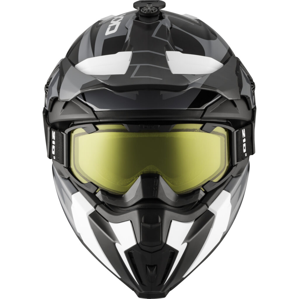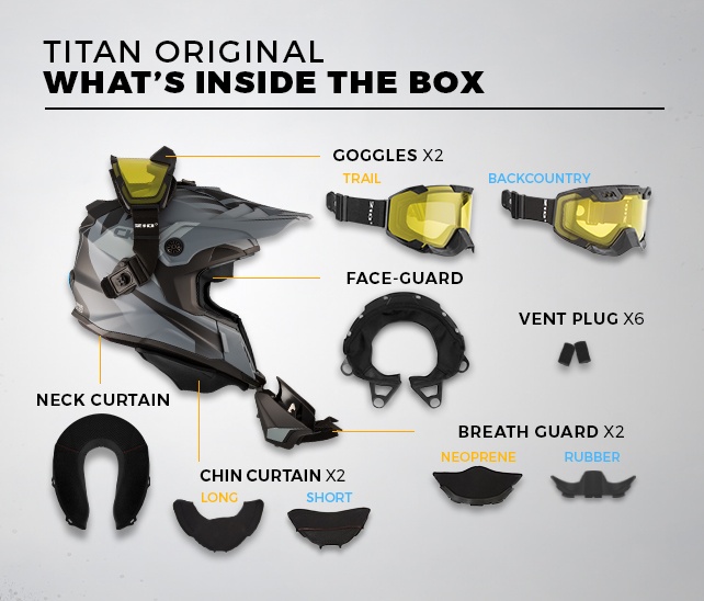 Celoroční sklolaminátová helma, snadné přizpůsobení pro zimu nebo léto, dvoje brýle, otevírací brada, extrémně velké zorné pole, dva bradové spoilery, dva nosní deflektory, těsnící manžeta kolem obličeje, vyjímatelné vložky větracích otvorů, regulovatelné větrání, vyjímatelný a pratelný interiér, držák na kameru, ECE 22.05