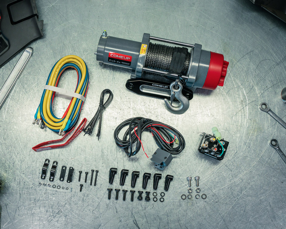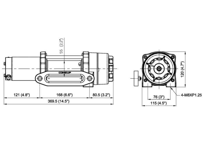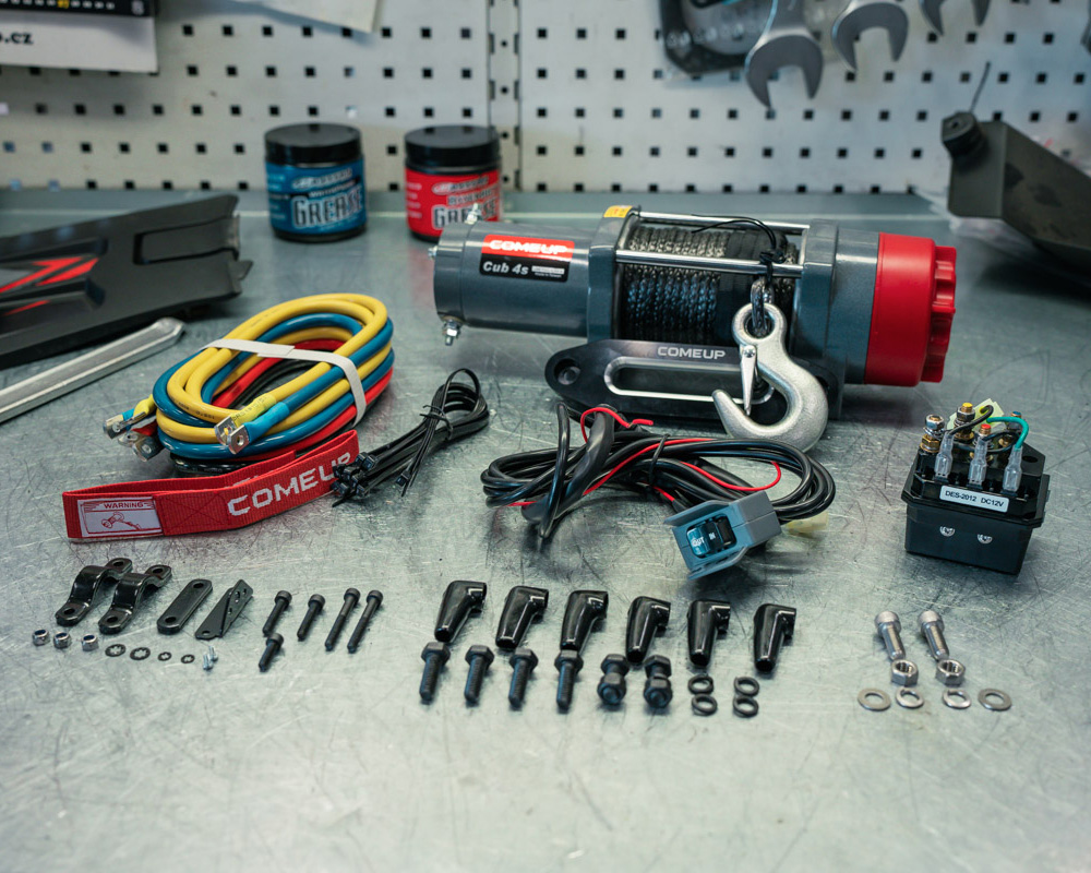 Elektrický lanový naviják, tažná síla 4000 lbs (1800 kg), syntetické lano, centrovaný navíjecí buben, mechanická i dynamická brzda, DC motor 800W / 1,0HP, 12V, třístupňová převodovka, utěsněné konektory, ovládání na řídítkách