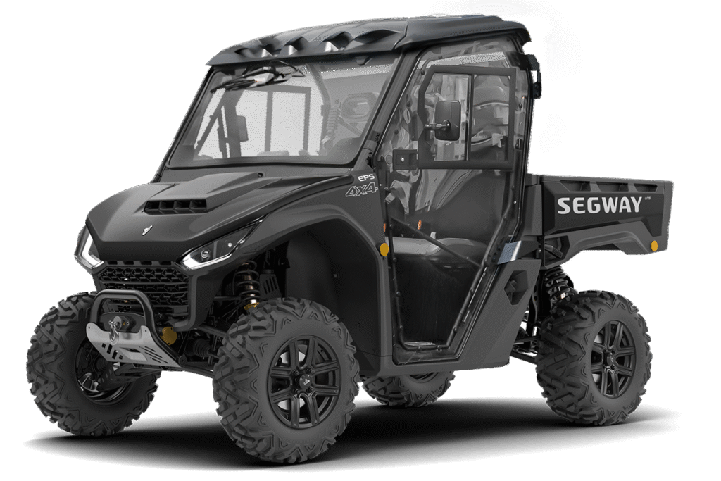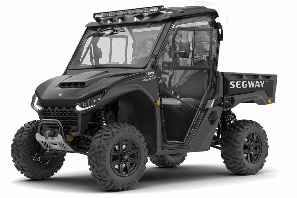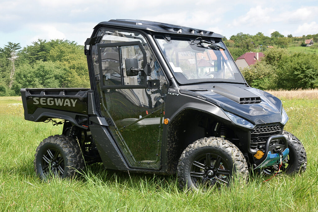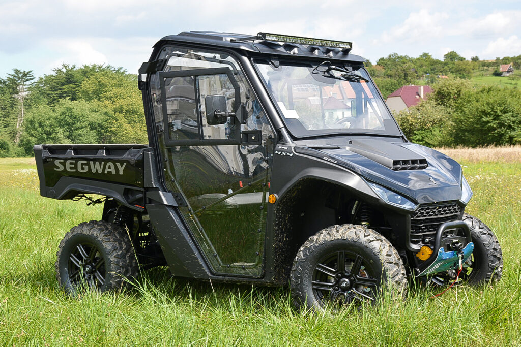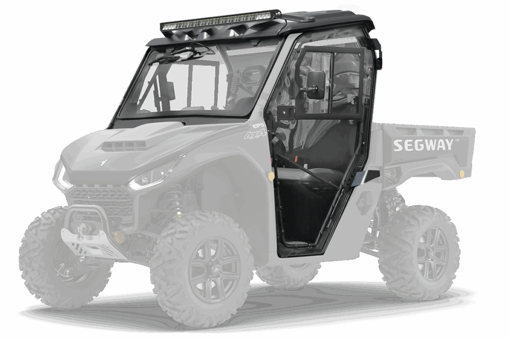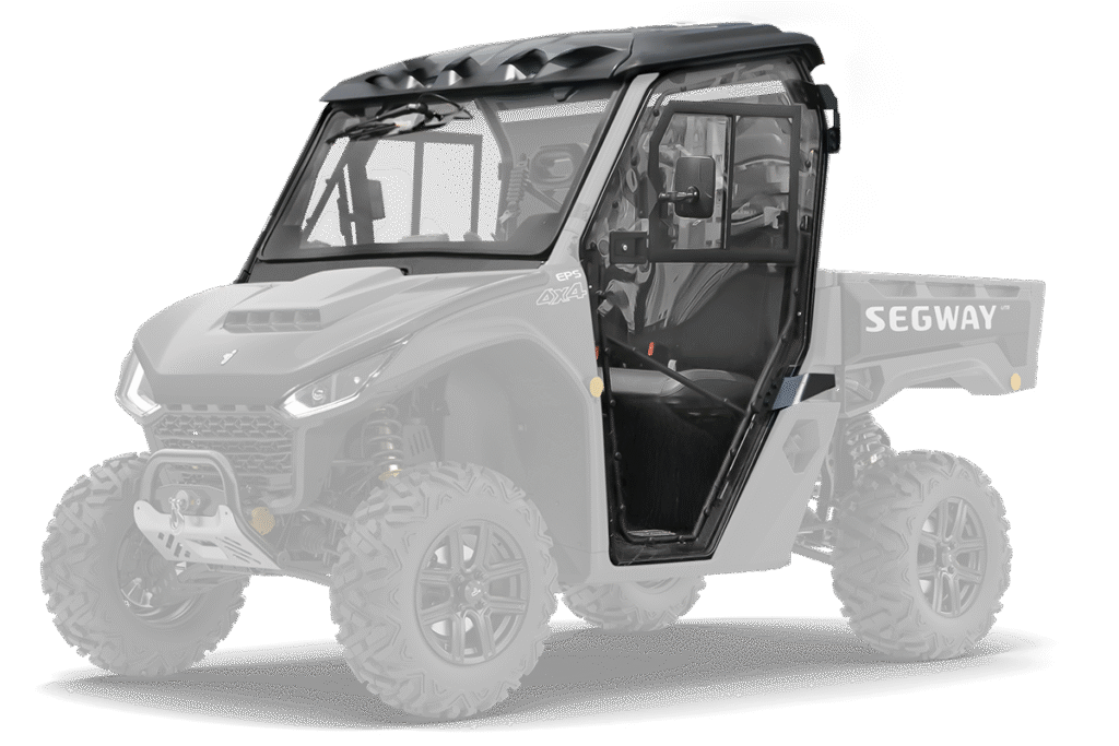 Vyhřívaná kabina pro Segway Fugleman UT6, čiré polykarbonátové dveře, uzamykatelné s posuvnými okny, přední okno z bezpečnostního skla se stěračem a ostřikovačem, zadní čelo z čirého tvrzeného UV-odolného polykarbonátu, teplovodní topení