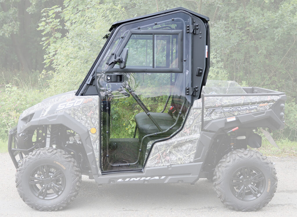 Vyhřívaná kabina pro UTV Linhai 520/550/570/650 T-BOSS, čiré polykarbonátové dveře, uzamykatelné, o 180° otevíratelné, s posuvnými okny, přední okno z bezpečnostního skla se stěračem a ostřikovačem, zadní čelo z čirého tvrzeného UV-odolného polykarbonátu, teplovodní topení