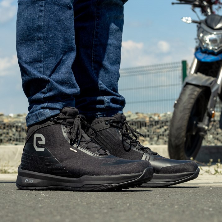 Pevné kotníkové nepromokavé boty na motorku, cestování, výlety, do města, na skútr a pro volný čas, vysoké pohodlí, odolná tkanina s voděodolnou prodyšnou membránou, zapínání pomocí šněrování, podrážka z trvanlivé pryže / Eva