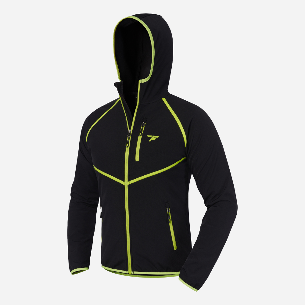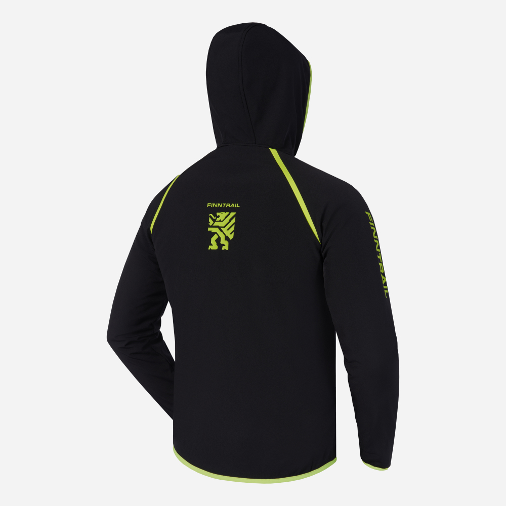 Vylepšená větruvzdorná vodoodpudivá softshellová bunda do mírného počasí, 3vrstvý softshell, fleecová podšívka, štíhlý slim střih, elastické obruby pro pohodlné nošení a ochranu před větrem, chladem a deštěm, vnitřní větrná ochrana za středovým zipem, náprsní kapsa na zip a dvě boční kapsy, originální design FINNTRAIL