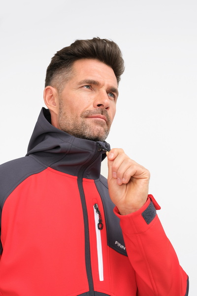 Větruvzdorná vodoodpudivá softshellová bunda do mírného počasí, 3vrstvý softshell, fleecová podšívka, štíhlý slim střih, elastické obruby pro pohodlné nošení a ochranu před větrem, chladem a deštěm, vnitřní větrná ochrana za středovým zipem, náprsní kapsa na zip a dvě boční kapsy, originální design FINNTRAIL
