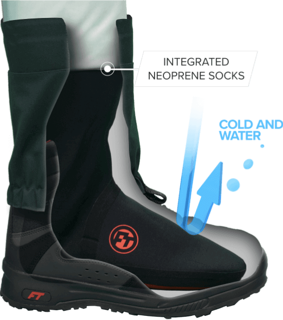 Extrémně odolné vysoké brodící kalhoty s integrovanými neoprenovými ponožkami, z robustní pětivrstvé tkaniny s membránou HARD-TEX, namáhaná místa vyztužená, anatomický střih, voděodolnost 25 000 mm, prodyšnost 7 000g/m2/24 hod, svrchní vodoodpudivá úprava Teflon™ DuPont®, 4 mm neoprenové ponožky se zesíleným chodidlem, vodotěsné pouzdro na mobil, taška na přenášení