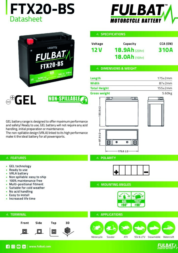 Gelový akumulátor FTX20L-BS GEL (YTX20-BS), 12V/18Ah, 270A, VRLA AGM, rozměry 175x87x155mm