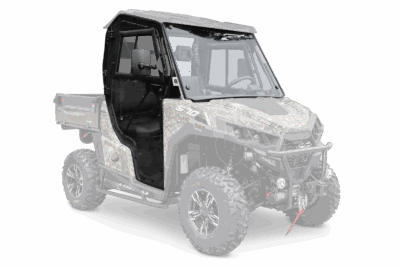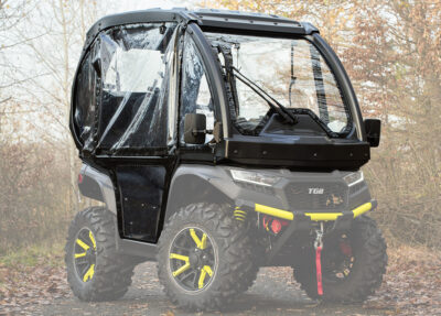 Kompletní kabina pro čtyřkolku Segway Snarler AT6 L, vyhřívané čelní sklo se stěračem a ostřikovačem, na magnety lehce uzavíratelné plachtové dveře. Chrání jezdce před povětrnostními vlivy a znečištěním