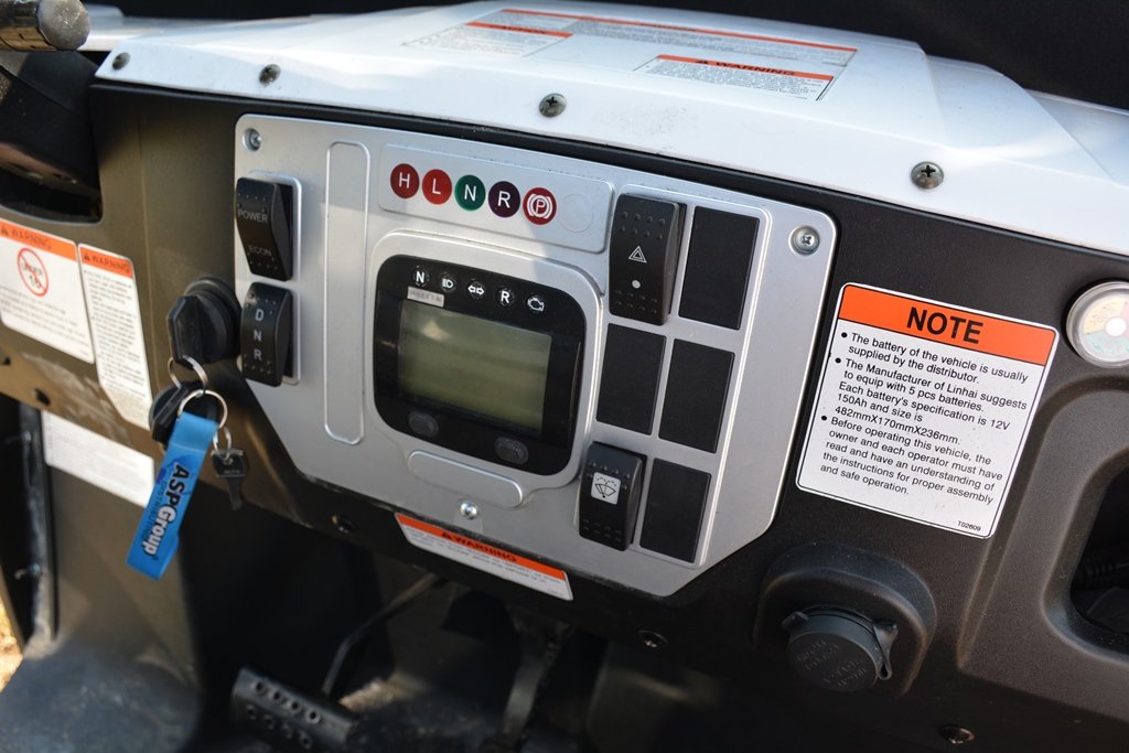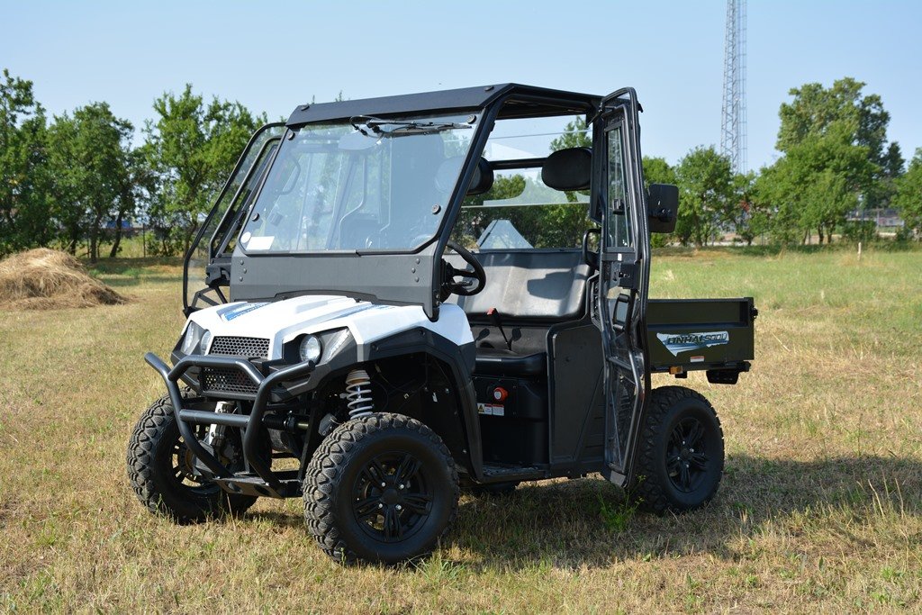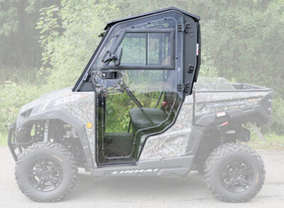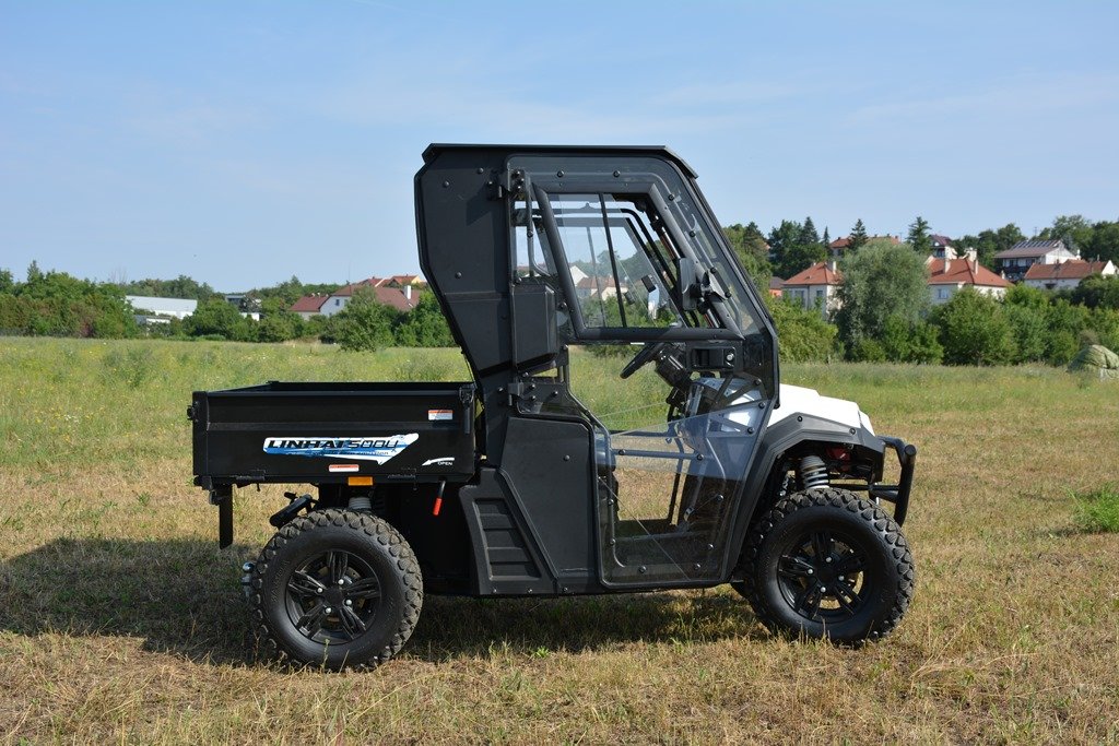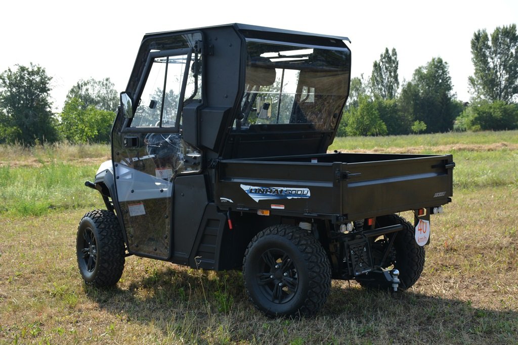 Kabina pro Linhai UTV LH50DU Electric se střechou, čiré polykarbonátové dveře, uzamykatelné s posuvnými okny, přední okno z bezpečnostního skla se stěračem a ostřikovačem, zadní čelo z čirého tvrzeného UV-odolného polykarbonátu