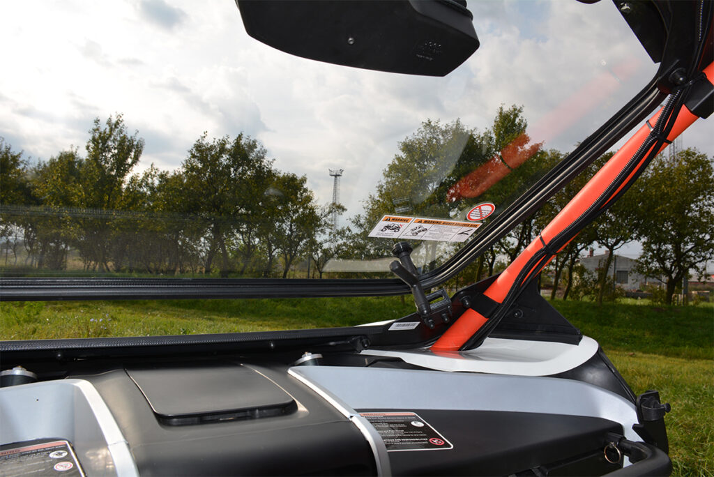 Vyhřívaná kabina pro Segway Villain SX10, čiré polykarbonátové dveře, uzamykatelné s posuvnými okny, přední okno z bezpečnostního skla se stěračem a ostřikovačem, zadní čelo z čirého tvrzeného UV-odolného polykarbonátu, teplovodní topení