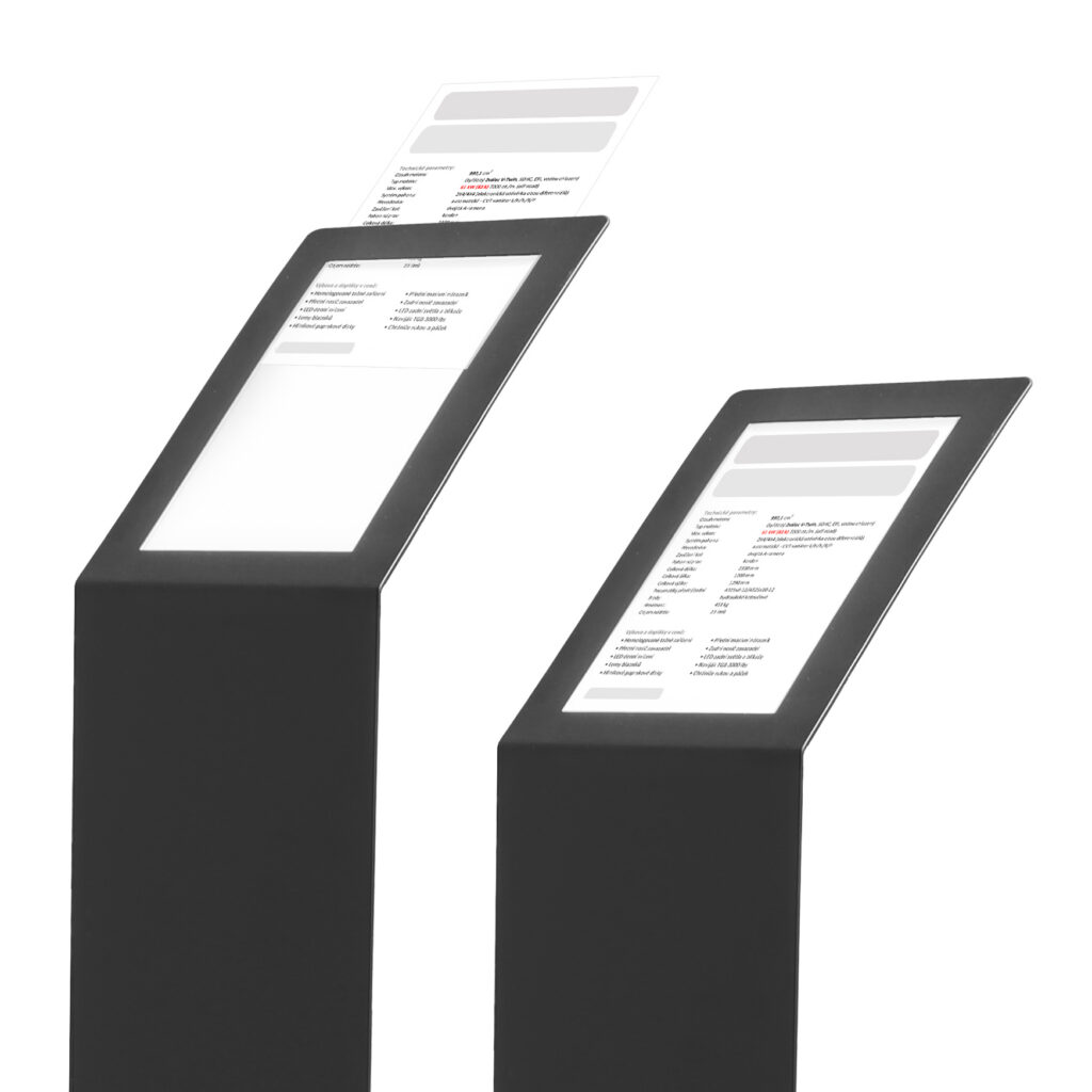 Prezentační stojan s plastovou kapsou na leták formátu A4. Konstrukce z ohýbané práškově lakované oceli. Plastové plastické 3D logo