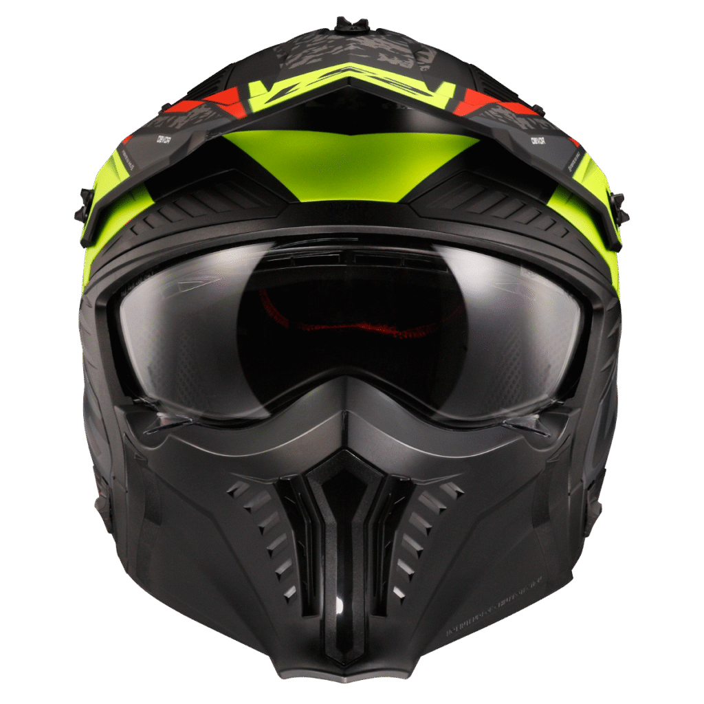 Flexibilní trial helma s agresivním designem, odnímatelný chránič brady s nastavitelným a odnímatelným kšiltem, vyjímatelné plexi s úpravami proti poškrábání a mlžení, větrání Dynamic Flow-­through Ventilation, vyjímatelný a pratelný interiér, zapínání rychlopřezkou, hmotnost 1350g