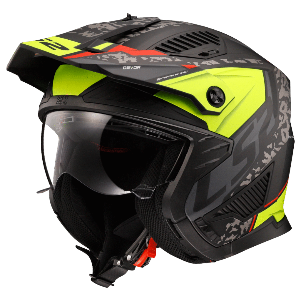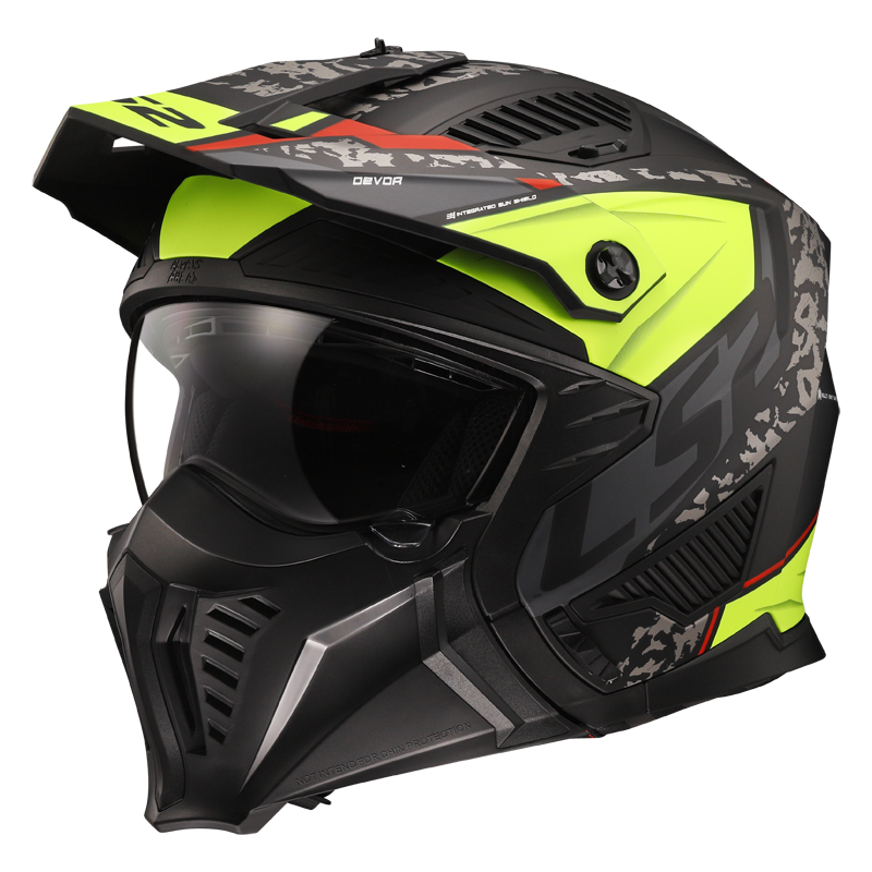 Flexibilní trial helma s agresivním designem, odnímatelný chránič brady s nastavitelným a odnímatelným kšiltem, vyjímatelné plexi s úpravami proti poškrábání a mlžení, větrání Dynamic Flow-through Ventilation, vyjímatelný a pratelný interiér, zapínání rychlopřezkou, hmotnost 1350g