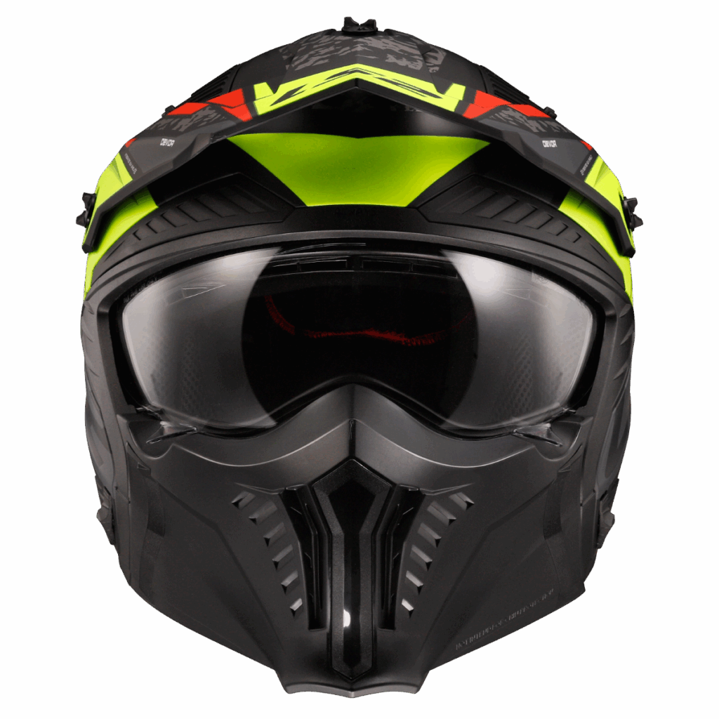 Flexibilní trial helma s agresivním designem, odnímatelný chránič brady s nastavitelným a odnímatelným kšiltem, vyjímatelné plexi s úpravami proti poškrábání a mlžení, větrání Dynamic Flow-through Ventilation, vyjímatelný a pratelný interiér, zapínání rychlopřezkou, hmotnost 1350g
