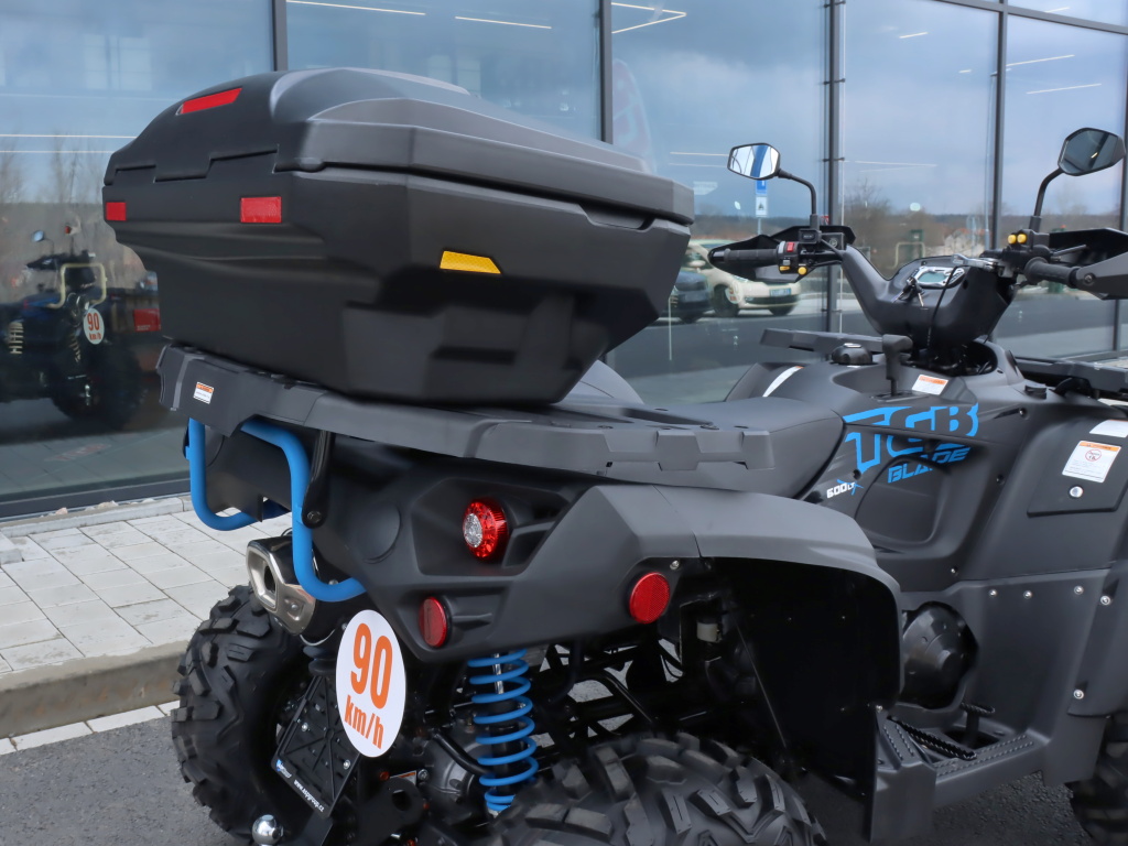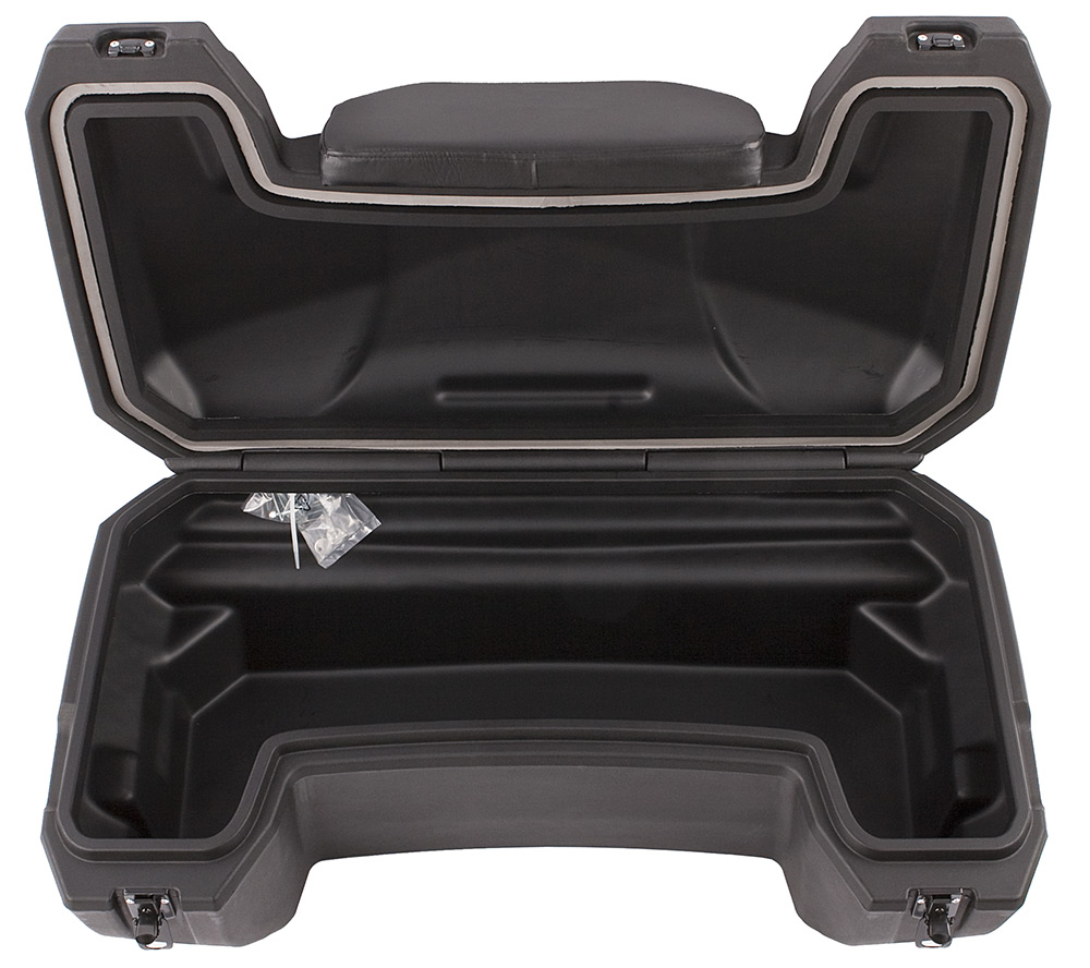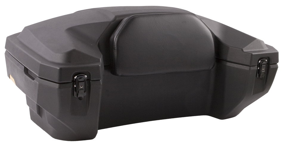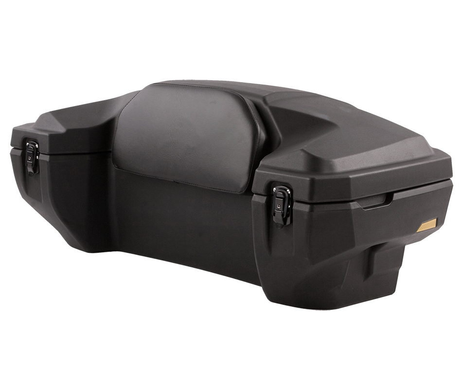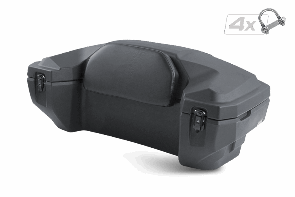 Velký uzamykatelný zadní box na čtyřkolku, objem 81 litrů, zamykání na dvě uzamykatelné západky, těsnění proti vnikání vody, pohodlná čalouněná opěrka zad, dvě zadní odrazky, rozměry 98 x 43 x 55 (41) cm (D x Š x V)