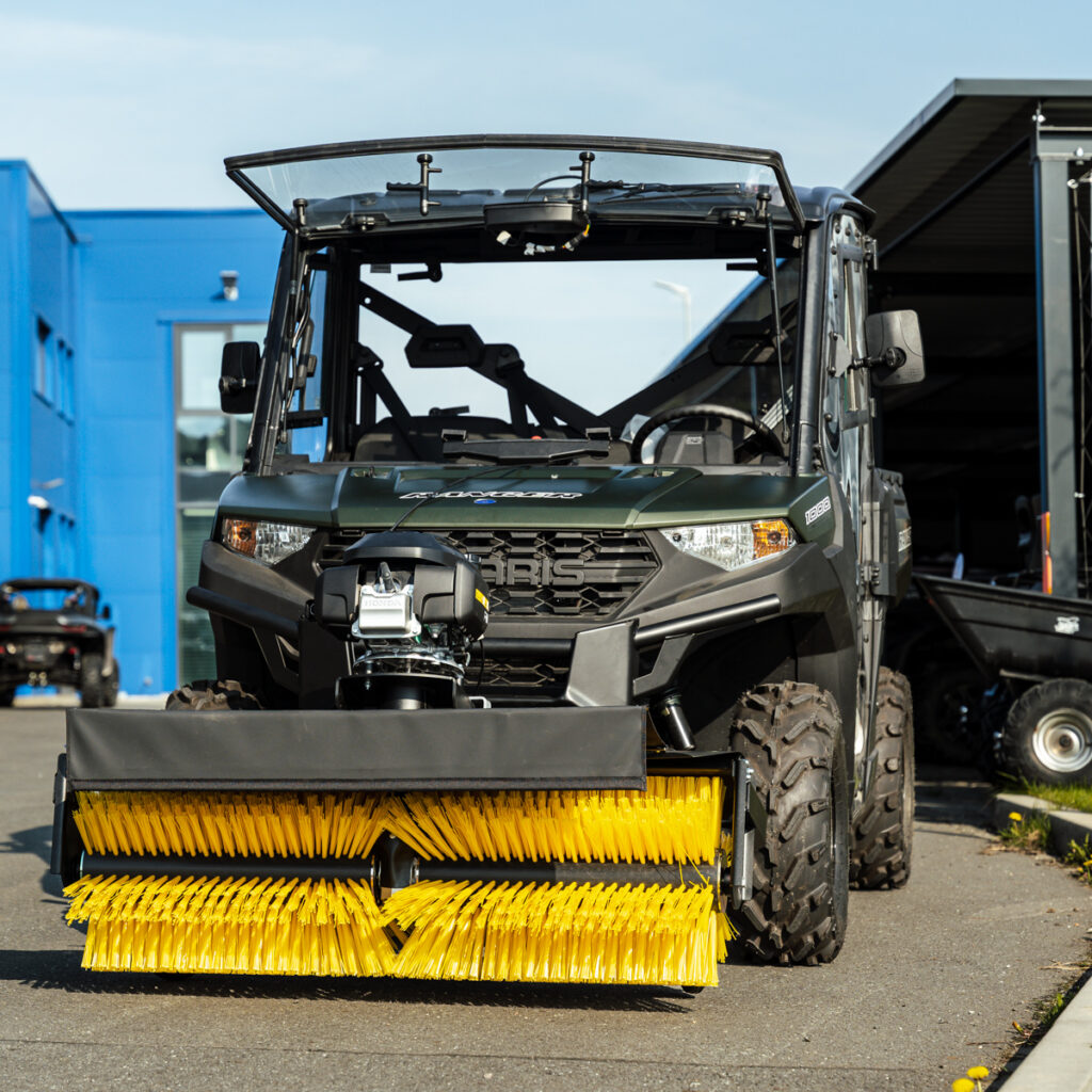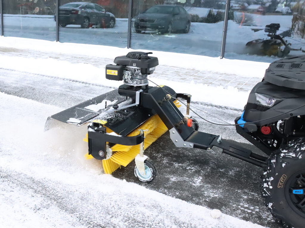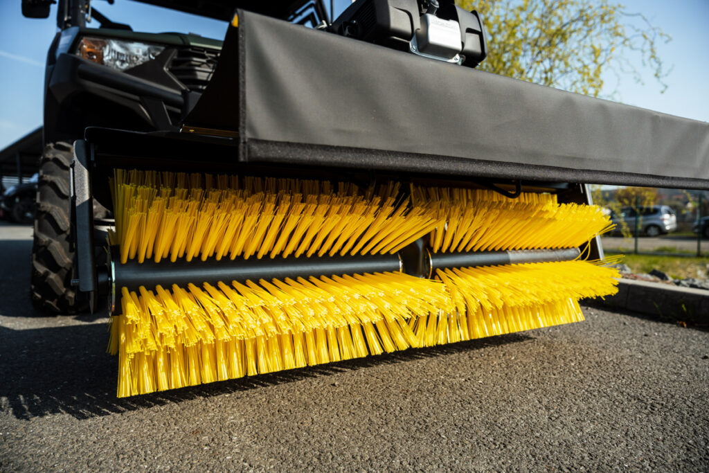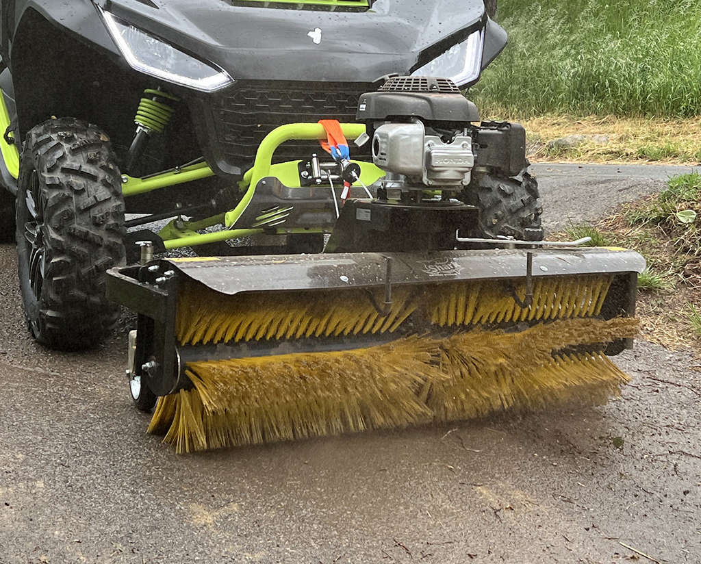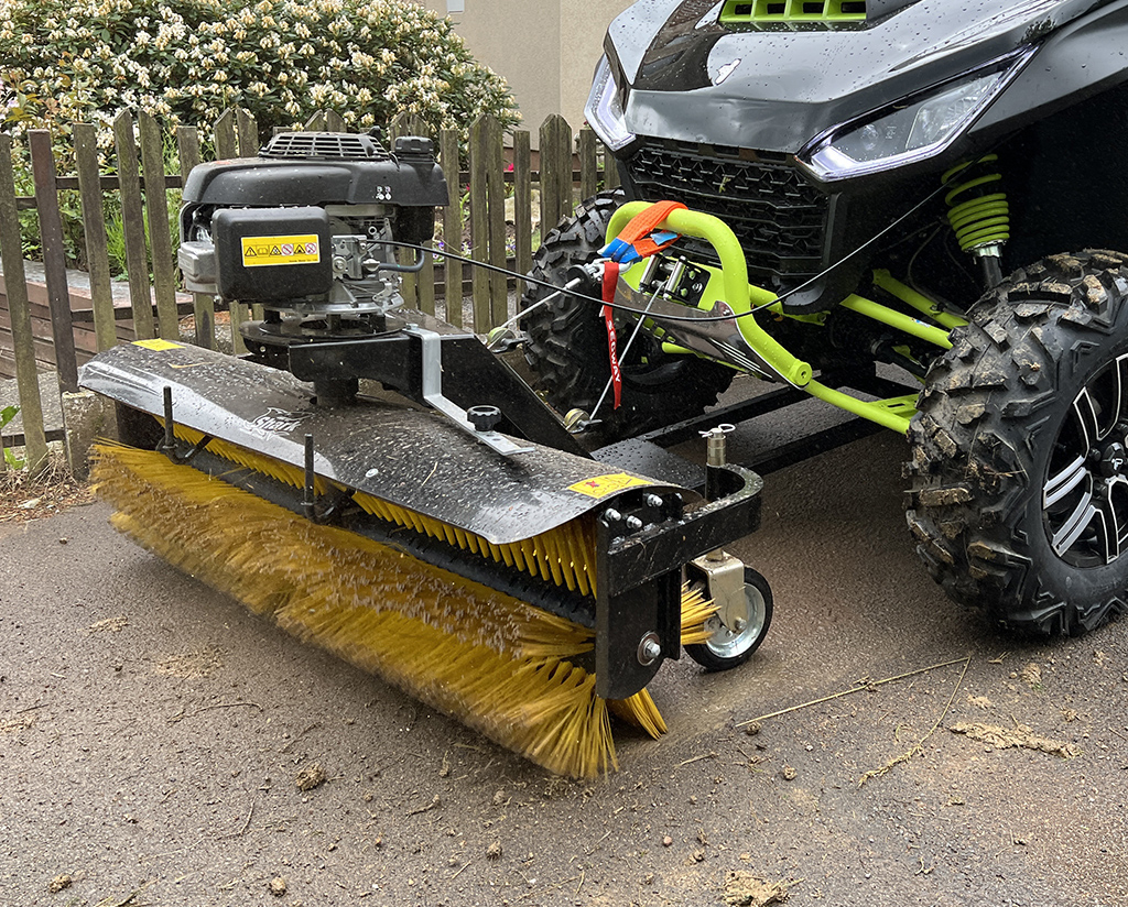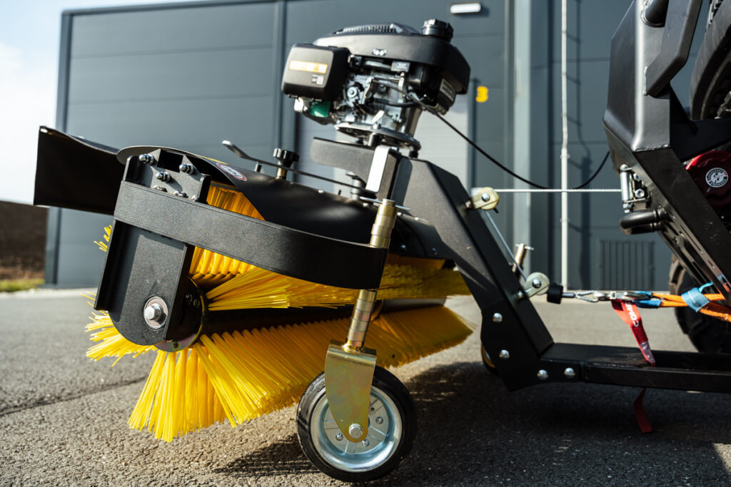 Zametací kartáč SHARK pro užitkové čtyřkolky / UTV, samostatný benzínový motor HONDA 6.5 HP, robustní konstrukce, rychlé nasazení i demontáž bez potřeby nářadí, snadné ovládání z místa řidiče, natáčení kartáče vpravo i vlevo, pracovní záběr 1300 mm