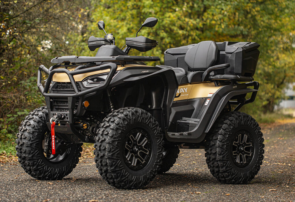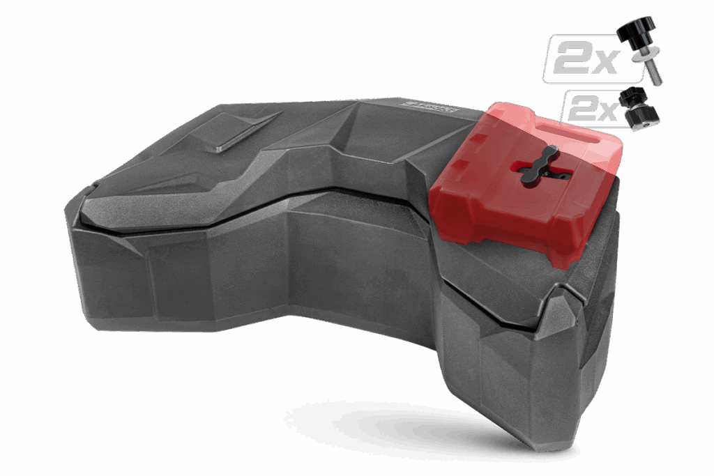 Prostorný uzamykatelný zadní box na čtyřkolku o objemu 145 litrů, těsnění proti vnikání vody, dvě zadní odrazky, zamykání na dvě kovové přezky, rychloupínací sada součástí balení