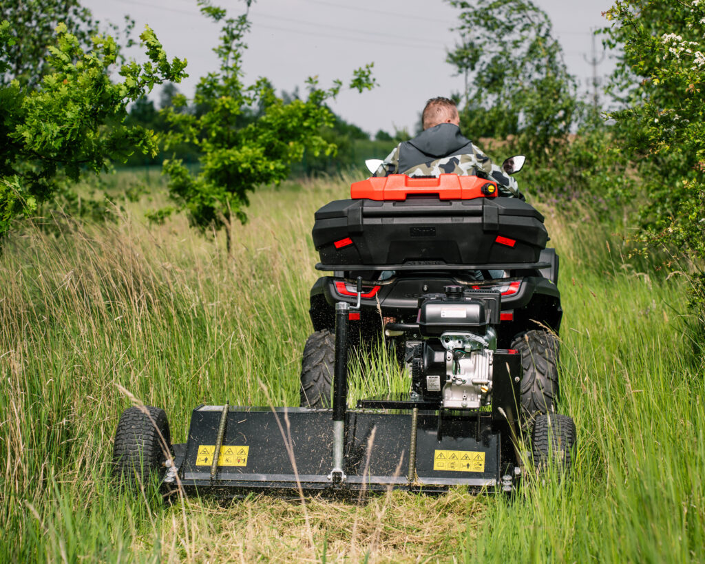 Profesionální mulčovací sekačka k připojení za čtyřkolku, čtyřdobý motor Kohler CH440, 10.5kW / 14HP, pro sekání a mulčování trávy, udržování trávníků, nastavitelná výška sečení 1-10cm, šířka záběru 120cm