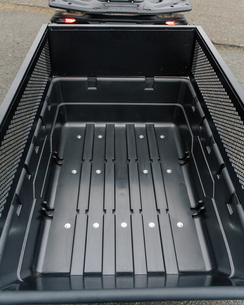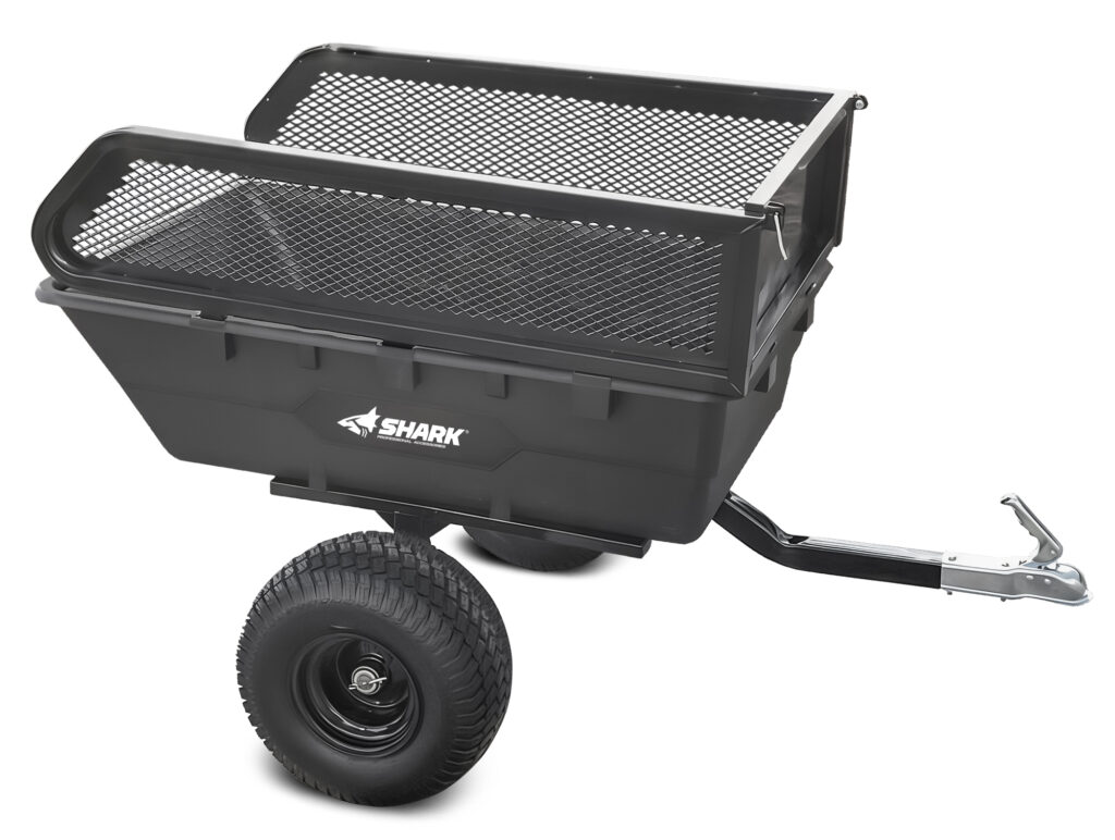 Praktický lehký sklápěcí ATV vozík s velkou plastovou korbou, odnímatelné ocelové bočnice, nosnost 300 kg, robustní práškově lakovaná konstrukce, hmotnost pouze 58 kg, rozměry 180 x 115 x 76 cm, nízkotlaké terénní extra široké pneumatiky 18×9.5-8
