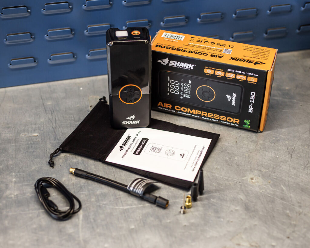 Kompaktní akumulátorový kompresor na huštění pneumatik / nouzová powerbanka 2000mAh / LED světlo. Vhodný pro automobily, čtyřkolky, motocykly, kola a míče s měřičem tlaku v pneumatikách.