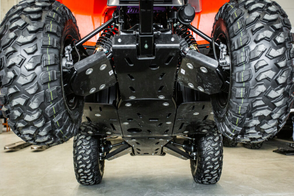Kompletní sada ochranných krytů podvozku, která chrání podvozek a ramena vaší čtyřkolky před kameny a úlomky, odolná a lehká konstrukce, obsahuje kompletní kryt rámu s ochranou podlahové desky, přední a zadní chrániče ramen, přední a zadní ochranné desky, přístupové otvory a výřezy pro snadnou údržbu