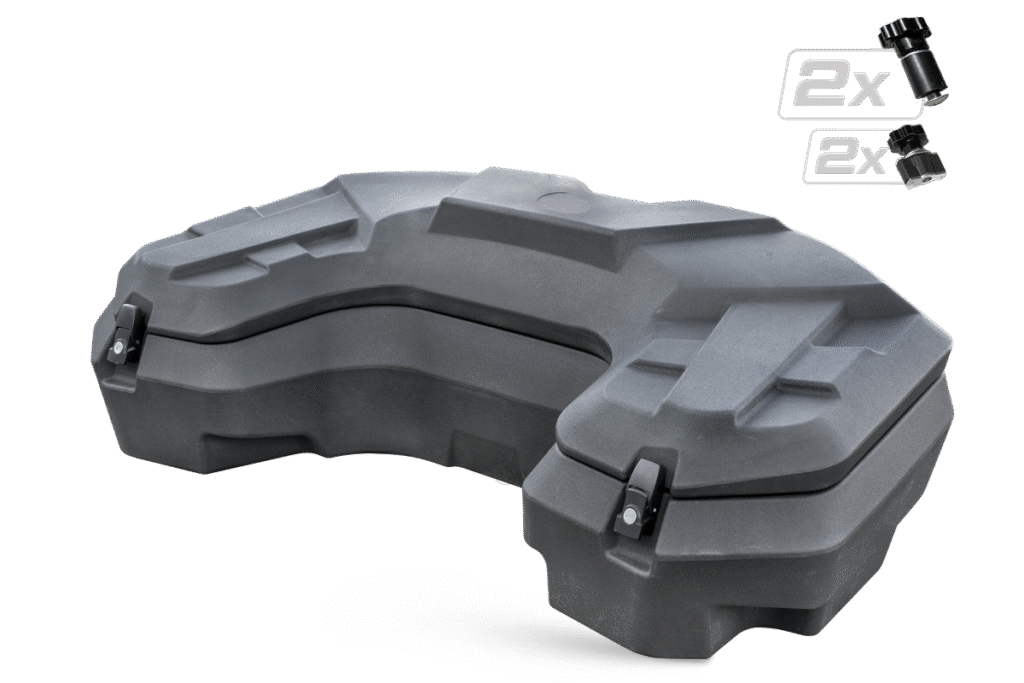 Uzamykatelný zadní box na čtyřkolku o objemu 110 litrů, těsnění proti vnikání vody, dvě zadní odrazky, zamykání na dvě kovové přezky, rychloupínací sada součástí balení