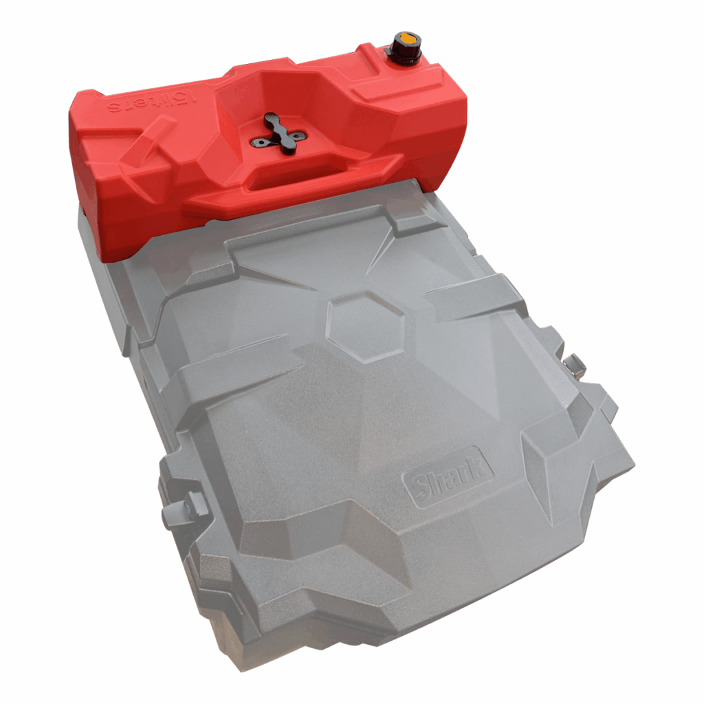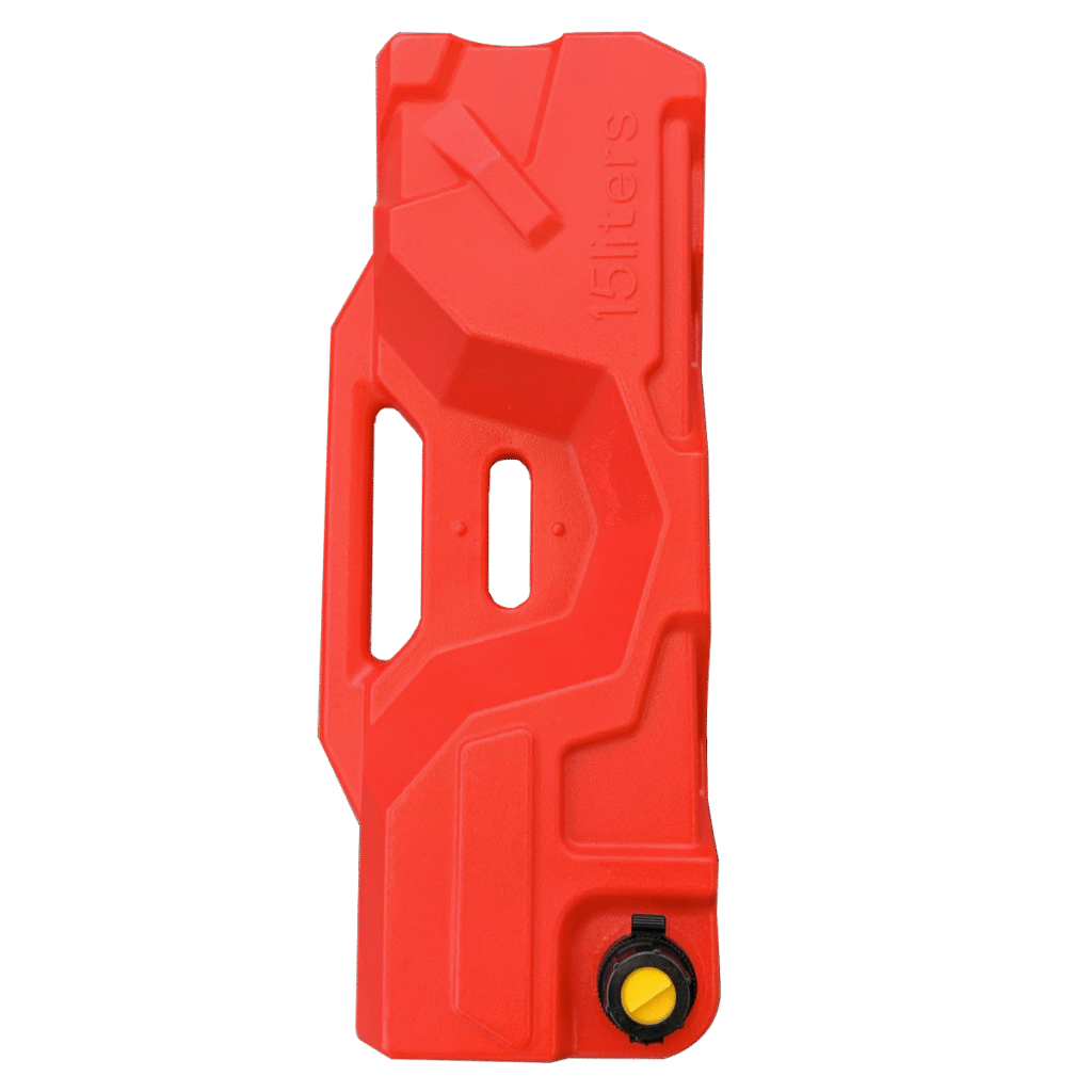 Plastový kanystr na pohonné hmoty s novým designem a objemem 15l, šroubovací uzávěr, včetně kovového držáku pro uchycení kanystru a montážní sady