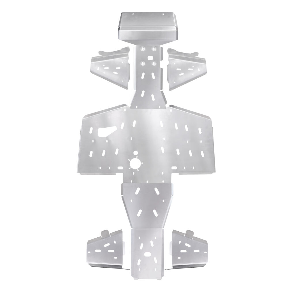 Kompletní hliníkové kryty podvozku Shark, odolná ochrana spodní části stroje, z lehkého 4 mm duralu letecké kvality, montážní otvory pro snadnou údržbu, výřezy pro snadný odtok vody a bláta, včetně integrovaných krytů nášlapů, nízká hmotnost, snadná montáž