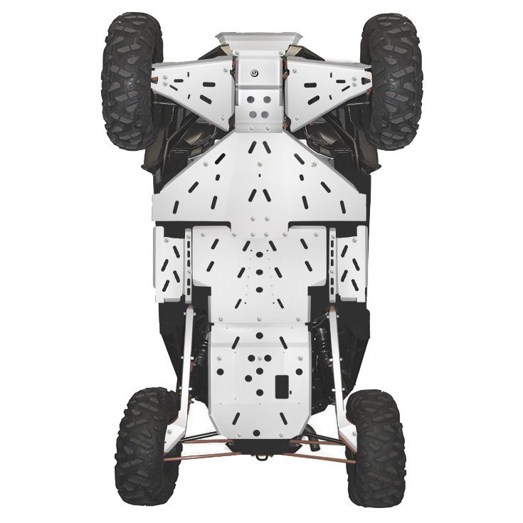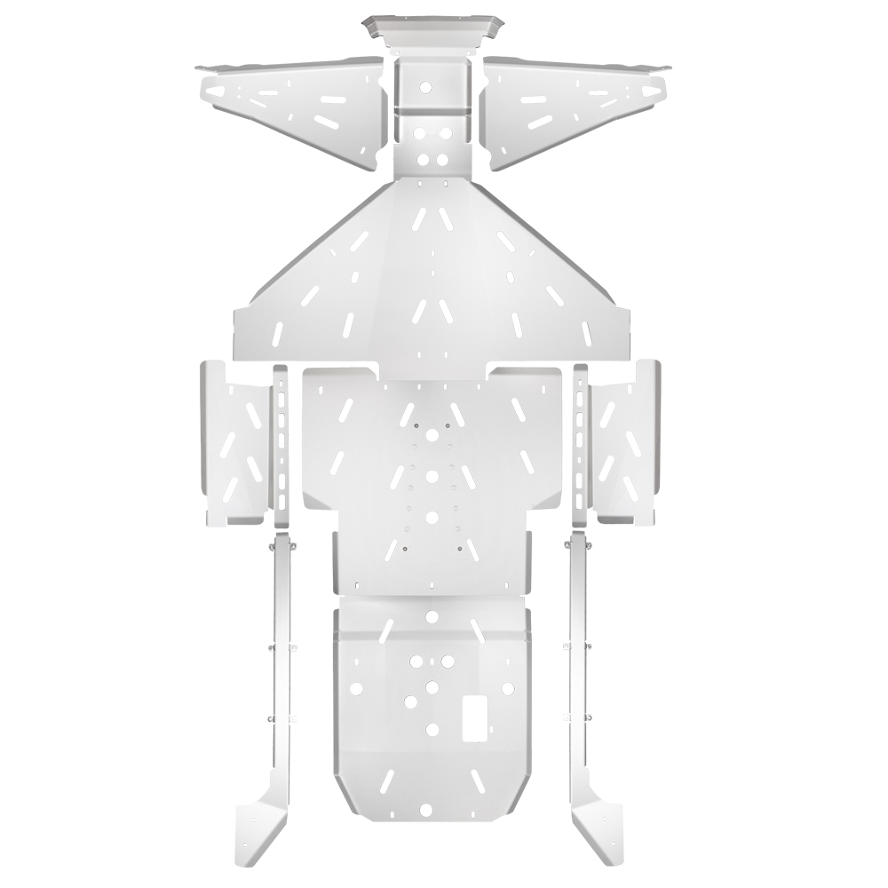 Kompletní kryty podvozku Shark Accessories, odolná ochrana spodní části čtyřkolky, z lehkého 4 mm hliníku letecké kvality, montážní otvory pro snadnou údržbu, výřezy pro snadnější čištění čtyřkolky, včetně integrovaných krytů nášlapů, nízká hmotnost, snadná montáž